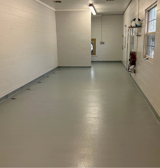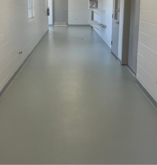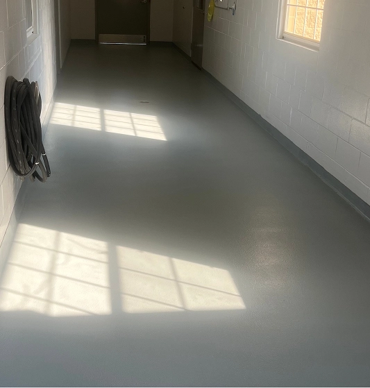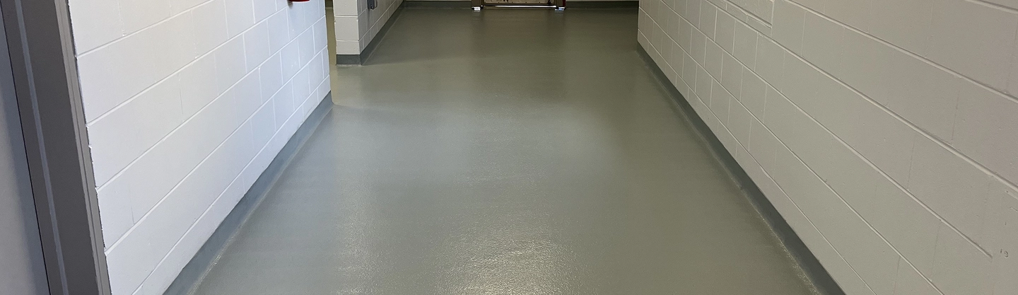 Smooth gray epoxy floor coating in a clean, sanitary hallway at an animal services facility, featuring cove base and block walls for easy maintenance.